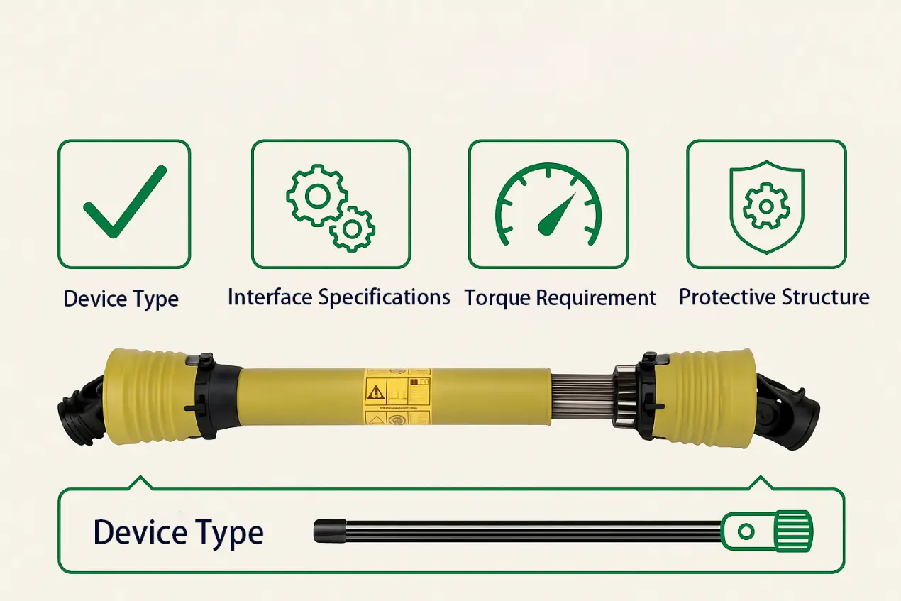 ပထမအချက်မှာစိုက်ပျိုးရေးစက်ယန္တရားအမျိုးအစားကိုချိတ်ဆက်ရန်အတည်ပြုရန်လိုအပ်သည်။ ကွဲပြားခြားနားသောပစ္စည်းကိရိယာများသည် PTO ရိုးတံ၏ဖွဲ့စည်းပုံ, အရှည်, interface form နှင့်ကွဲပြားခြားနားသောလိုအပ်ချက်များကိုရှိသည်။ ဥပမာအားဖြင့် - အလျားလိုက်အစာပိုးဓာတ်ပေါင်းစည်းသူများသည်ယေဘုယျအားဖြင့် PTO ရိုးတံများသို့မဟုတ် clutch ကာကွယ်မှုနှင့်အတူ PTO ရိုးတံလိုအပ်သည်။ အလှည့်မျောက်များသည်တစ်ကမ္ဘာလုံးအတိုင်းအတာဖြင့်လုပ်ဆောင်မှုများကိုမကြာခဏရှုထောင့်၏အပြောင်းအလဲများနှင့်အတူအလုပ်လုပ်ရန်အပြည်ပြည်ဆိုင်ရာအဆစ်နှင့်အတူလက်ဝါးကပ်တိုင်အဆစ်နှင့်အတူမော်ဒယ်များအတွက်ပိုမိုသင့်လျော်သည်; ထိုသို့သောစွမ်းဆောင်ရည်မြေသွဇာဓာတ်မြေသွဇာထုတ်လုပ်သူများကဲ့သို့သောပစ္စည်းကိရိယာများအတွက်မြောင်းကိုလှည့်သောအခါသို့မဟုတ်ဖြတ်ကူးသောအခါရိုးတံကိုပျက်ခြင်းမခံရစေရန်အခမဲ့တိုးချဲ့ခြင်းနှင့်ပြန်လည်ဆုတ်ခွာခြင်းအားဖြင့်ဂရုပြုသင့်သည်။