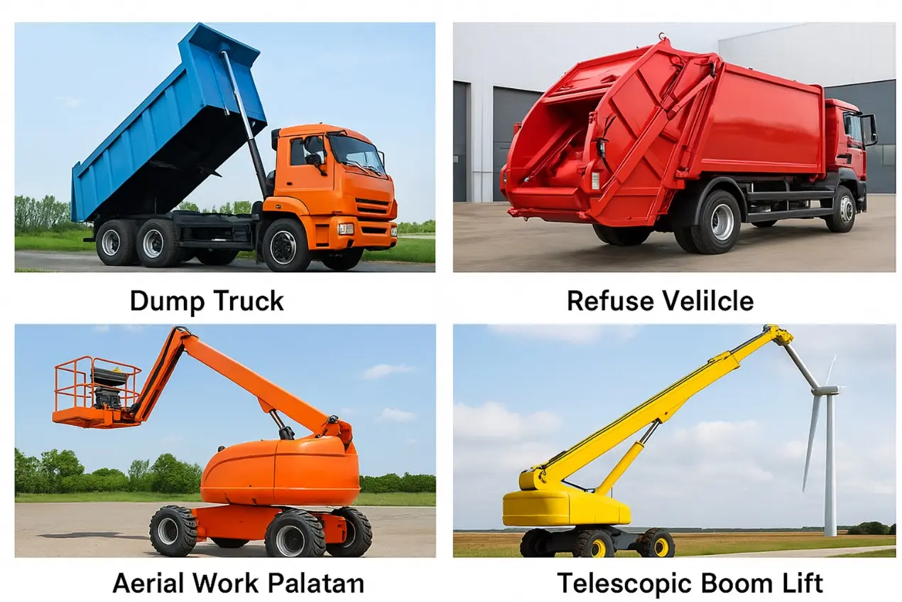 Dump ကုန်တင်ကားများတွင် Multi-street hydraulic ဆလင်ဒါများသည်လေးလံသောဝန်များကိုလျင်မြန်စွာစွန့်ပစ်ရန်ရထားကိုမြှင့်တင်ရန်အသုံးပြုသည်။ သန့်ရှင်းရေးအမှိုက်သရိုက်များ, ဟိုက်ဒရောလစ်ဆလင်ဒါများသည်ထိရောက်သောလည်ပတ်မှုကိုသေချာစေရန်နောက်ဘက်အဖုံးဖွင့်စက်နှင့်ချုံ့ခြင်းစနစ်ကိုမောင်းနှင်ကြသည်။ ဝေဟင်ပိတ်ကပလက်ဖောင်းများသို့မဟုတ်ကတ်ကြေးထရပ်ကားများကဲ့သို့သောဝေဟင်လုပ်ငန်းပလက်ဖောင်းများတွင်၎င်းတို့သည်ရုတ်သိမ်းရေးလက်မောင်းနှင့်လည်ပတ်မှုပလက်ဖောင်းကိုမြှင့်တင်ရန်ထိန်းချုပ်သည်။ ထို့အပြင်စိုက်ပျိုးရေးအမှိုက်များ, နောက်တွဲယာဉ်ဟိုက်ဒရောလစ်ရေယာဉ်များနှင့်ဆောက်လုပ်ရေးပုံဆွဲဆောင်သူများသည်အလုပ်လုပ်ချက်များပြည့်စုံရန်အတွက်သူတို့၏ယုံကြည်စိတ်ချရသော pactionsescopic စရိုက်လက္ခဏာများအပေါ်မှီခိုအားထားကြသည်။